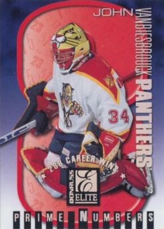 The John Vanbiesbrouck 1997 Donruss Elite #8c Prime Numbers Promos card is 1 of 23 John Vanbiesbrouck's card variations in the 1997 Donruss Elite set being tracked by Sports Card Investor, including #126 Base, #3 Base, #3 Aspirations, #126 Aspirations, and #8a Prime Numbers Promos.