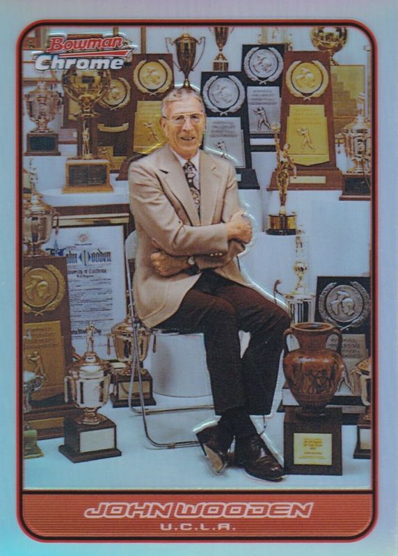 This card is 1 of 5 John Wooden's card variations in the 2006 Bowman set being tracked by Sports Card Investor, including Chrome, Chrome - X-Fractor /150, Chrome - Gold Refractor /50, and Chrome - Superfractor /1.