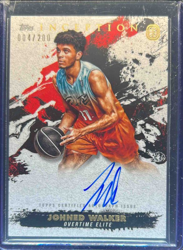 The Johned Walker 2021 Topps Inception OTE Overtime Elite #IA-JW1 Inception Autographs /200 card is 1 of 60 Johned Walker's card variations in the 2021 Topps Inception OTE Overtime Elite set being tracked by Sports Card Investor, including #43 Base, #66 Base, #53 Base, #53 Blue /199, and #43 Blue /199.