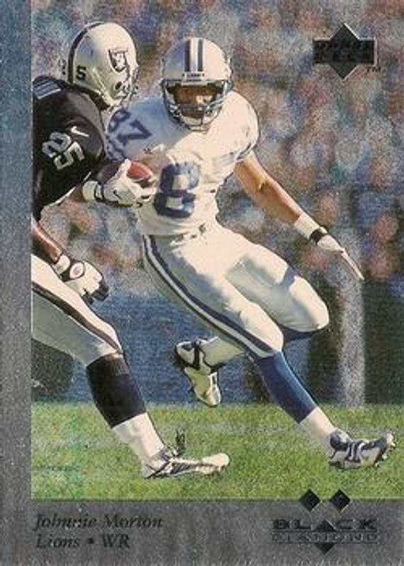The Johnnie Morton 1997 Upper Deck Black Diamond #121 Base card is 1 of 2 Johnnie Morton's card variations in the 1997 Upper Deck Black Diamond set being tracked by Sports Card Investor, including Gold.