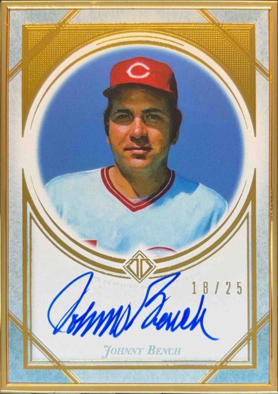 The Johnny Bench 2018 Topps Transcendent #TCA-JB Transcendent Collection Autographs /25 card is 1 of 11 Johnny Bench's card variations in the 2018 Topps Transcendent set being tracked by Sports Card Investor, including Base /83, Origins Sketch Reproductions /83, Transcendent Collection Autographs Emerald /15, Transcendent Collection Autographs Purple /10, and 1952 SuperFractor Autographs /1.