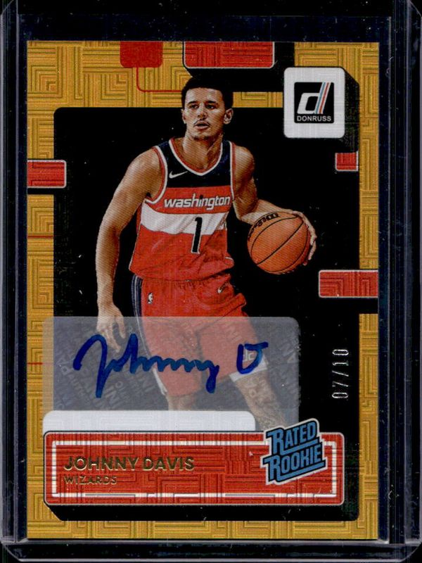 The Johnny Davis 2022 Donruss #210 Rated Rookie Signatures - Choice Gold /10 card is 1 of 50 Johnny Davis' card variations in the 2022 Donruss set being tracked by Sports Card Investor, including Base, Choice, Holo Green Laser, Holo Red & Gold Laser, and Press Proof Silver.