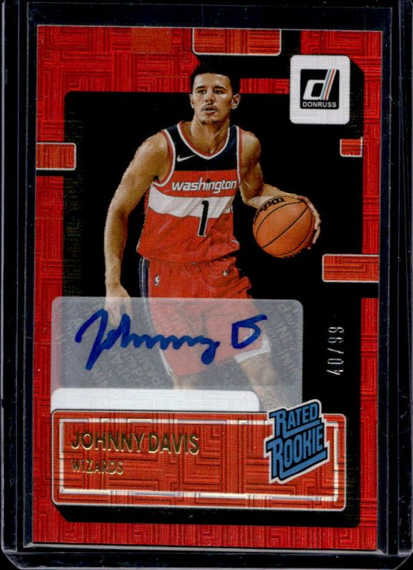 The Johnny Davis 2022 Donruss #210 Rated Rookie Signatures - Choice Red /99 card is 1 of 50 Johnny Davis' card variations in the 2022 Donruss set being tracked by Sports Card Investor, including Base, Choice, Holo Green Laser, Holo Red & Gold Laser, and Press Proof Silver.