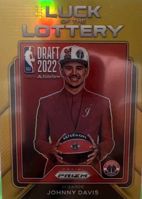 The Johnny Davis 2022 Prizm #12 Luck of the Lottery - Gold /10 Rookie card in Raw condition has not changed in price in the last 30 days and was last sold for $31.33 .