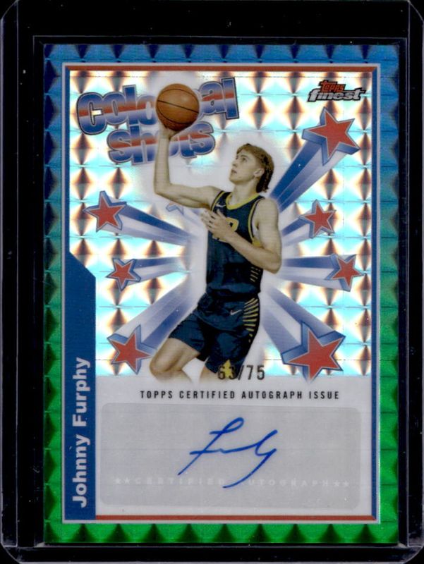 The Johnny Furphy 2024 Topps Finest #BSA-JF Colossal Shots Autographs - Green Geometric Refractor /75 Rookie card is 1 of 95 Johnny Furphy's card variations in the 2024 Topps Finest set being tracked by Sports Card Investor, including Arrivals, Arrivals - Geometric Refractor, Arrivals - Refractor, Arrivals - X-Fractor, and Base Uncommon.