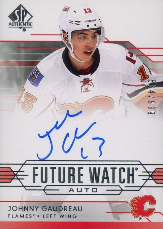 Johnny Gaudreau's Hockey cards are available in at least 144 sets. Johnny Gaudreau's biggest 7-day price movers are 2014 SP Authentic #306 Future Watch Auto /999, 2016 Upper Deck Ultimate Collection #NE-JG Numeric Excellence - Gold Patch /5, and 2017 Upper Deck Ultimate Collection #41 Shield Patch /1.