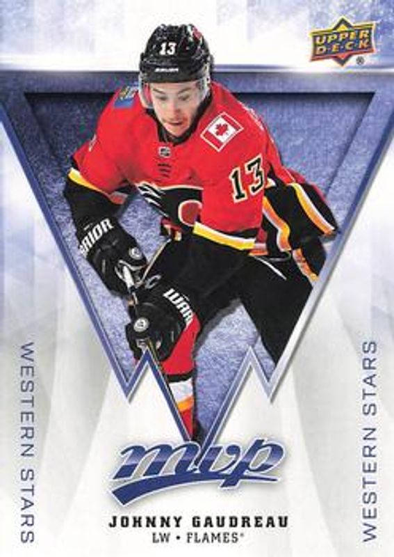 The Johnny Gaudreau 2019 Upper Deck MVP #WS-4 Western Stars card is 1 of 16 Johnny Gaudreau's card variations in the 2019 Upper Deck MVP set being tracked by Sports Card Investor, including Base, Blue, Gold Script, Silver Script, and Super Script /25.