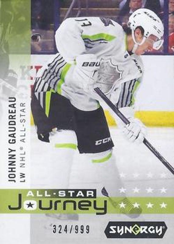 The Johnny Gaudreau 2019 Upper Deck Synergy #AP-4 All Star Journey 1st Appearance /999 card is 1 of 8 Johnny Gaudreau's card variations in the 2019 Upper Deck Synergy set being tracked by Sports Card Investor, including Cast For Greatness, Cast For Greatness Black, Impactful Performers, All Star Journey 2nd or Later Appearance /899, and All Star Journey 2018 Appearance /799.