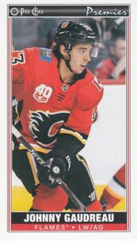 The Johnny Gaudreau 2020 O-Pee-Chee #P-27 O-Pee-Chee Premier Tallboys card is 1 of 11 Johnny Gaudreau's card variations in the 2020 O-Pee-Chee set being tracked by Sports Card Investor, including Base, Blue, Red, Retro, and Retro Blank Back.