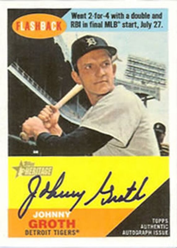 The Johnny Groth 2009 Topps Heritage #FBA-JG Flashbacks Autographs /25 card is 1 of 6 Johnny Groth's card variations in the 2009 Topps Heritage set being tracked by Sports Card Investor, including #171 50th Anniversary Buybacks, #JG Flashback Stadium Relics Autographs, #ROA-JG Real One Autographs, #JG Real One Autographs - Red Ink /60, and #ROA-JG Real One Autographs - Red Ink /60.