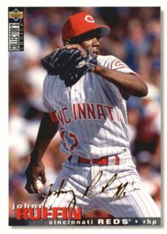 The Johnny Ruffin 1995 Upper Deck Collector's Choice #435 Gold Signatures card is 1 of 3 Johnny Ruffin's card variations in the 1995 Upper Deck Collector's Choice set being tracked by Sports Card Investor, including Base, and Silver Signatures.