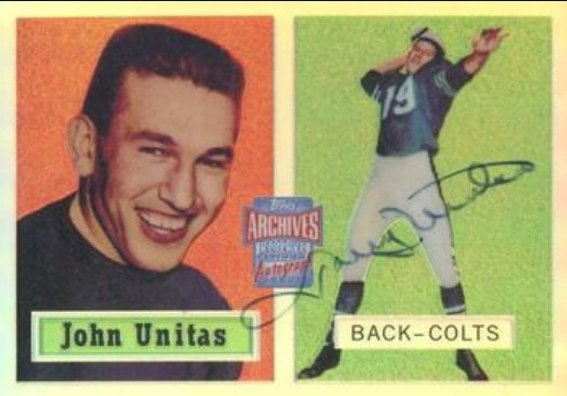 The Johnny Unitas 2001 Topps Archives Reserve #ARA-JU Rookie Reprint Autographs card is 1 of 2 Johnny Unitas' card variations in the 2001 Topps Archives Reserve set being tracked by Sports Card Investor, including Base.