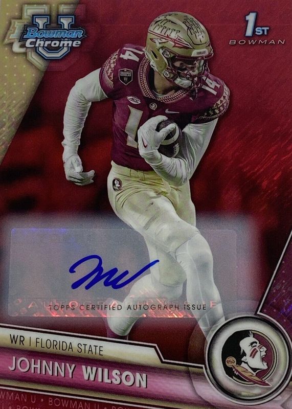 This card is 1 of 12 Johnny Wilson's card variations in the 2023 Bowman Chrome University set being tracked by Sports Card Investor, including Prospect Auto (1st), Prospect Auto - Refractor /499 (1st), Prospect Auto - Fuchsia Mini-Diamond Refractor /150 (1st), Prospect Auto - Green Refractor /99 (1st), and Prospect Auto - Yellow Refractor /75 (1st).