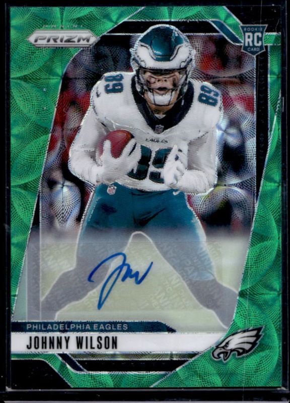 The Johnny Wilson 2024 Prizm #355 Base Autographs - Green Scope /75 Rookie card is 1 of 88 Johnny Wilson's card variations in the 2024 Prizm set being tracked by Sports Card Investor, including Base, Choice Blue Yellow Green, Choice Silver, Disco, and Green.