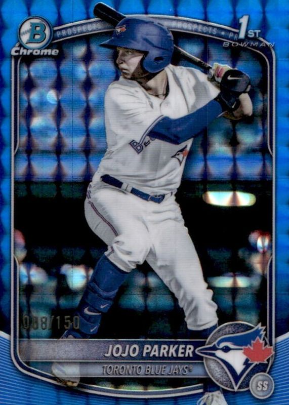 The JoJo Parker 2025 Bowman Draft #BDC-8 Chrome - Blue Geometric Refractor /150 (1st) card in Raw condition has moved up $5.50 (+11.8%) in the last 30 days and was last sold for $52.00 .