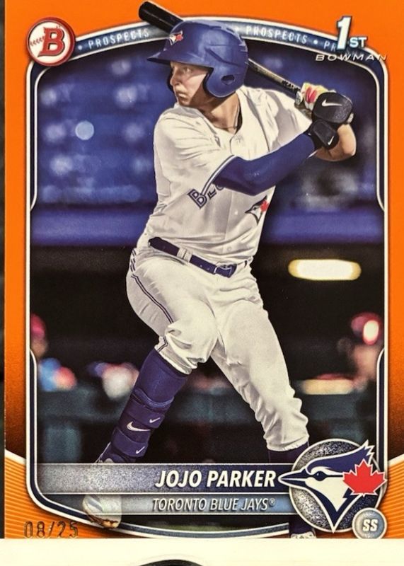 The JoJo Parker 2025 Bowman Draft #BD-40 Orange Border /25 (1st) card in Raw condition has moved up $64.99 (+76.5%) in the last 30 days and was last sold for $149.99 .