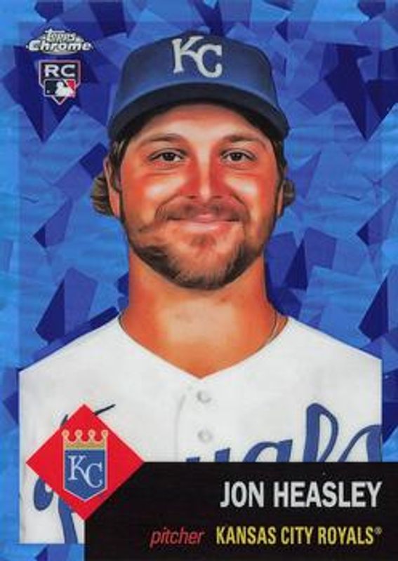 The Jon Heasley 2022 Topps Chrome Platinum Anniversary #266 Blue Atomic Refractor /100 Rookie card is 1 of 44 Jon Heasley's card variations in the 2022 Topps Chrome Platinum Anniversary set being tracked by Sports Card Investor, including Base, Black & White Mini Diamond Refractor, Blue Prism Refractor, Gold Prism Refractor, and Prism Refractor.