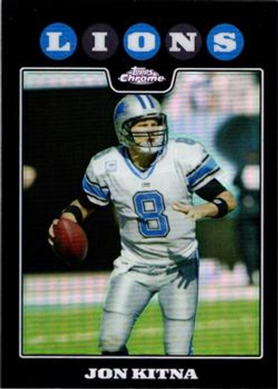 The Jon Kitna 2008 Topps Chrome #TC2 Refractor card is 1 of 12 Jon Kitna's card variations in the 2008 Topps Chrome set being tracked by Sports Card Investor, including Base, Printing Plates Black /1, Printing Plates Cyan /1, Printing Plates Magenta /1, and Printing Plates Yellow /1.