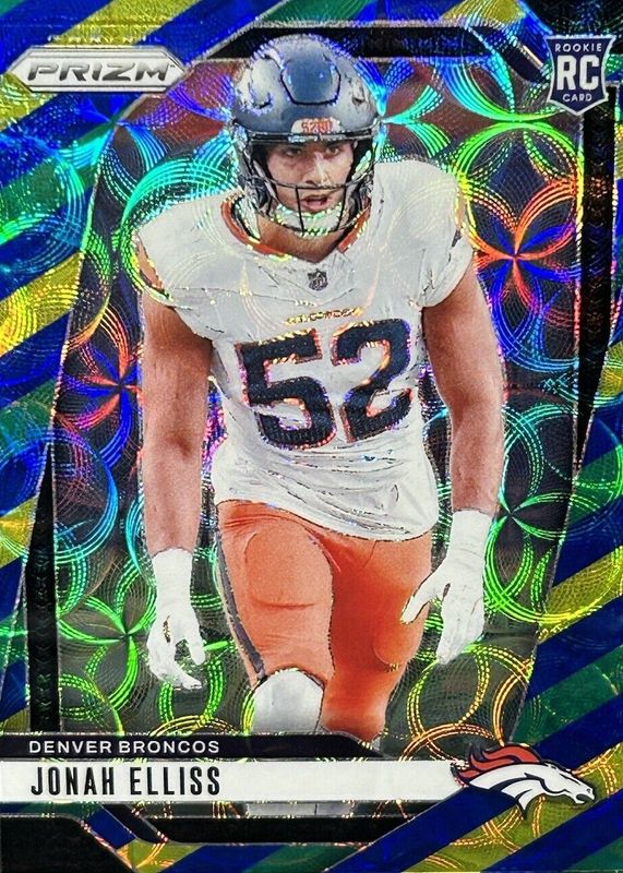 The Jonah Elliss 2024 Prizm #356 Choice Blue Yellow Green Rookie card in Raw condition has not changed in price in the last 30 days and was last sold for $11.24 .