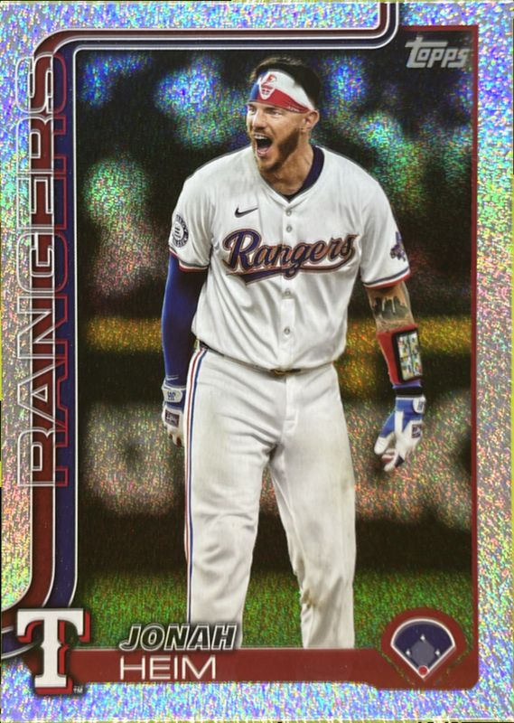 The Jonah Heim 2025 Topps #51 Sandglitter card is 1 of 63 Jonah Heim's card variations in the 2025 Topps set being tracked by Sports Card Investor, including Base, Aqua Holo Foil, Diamante Foil, Holo Foil, and Pink Diamante Foil.