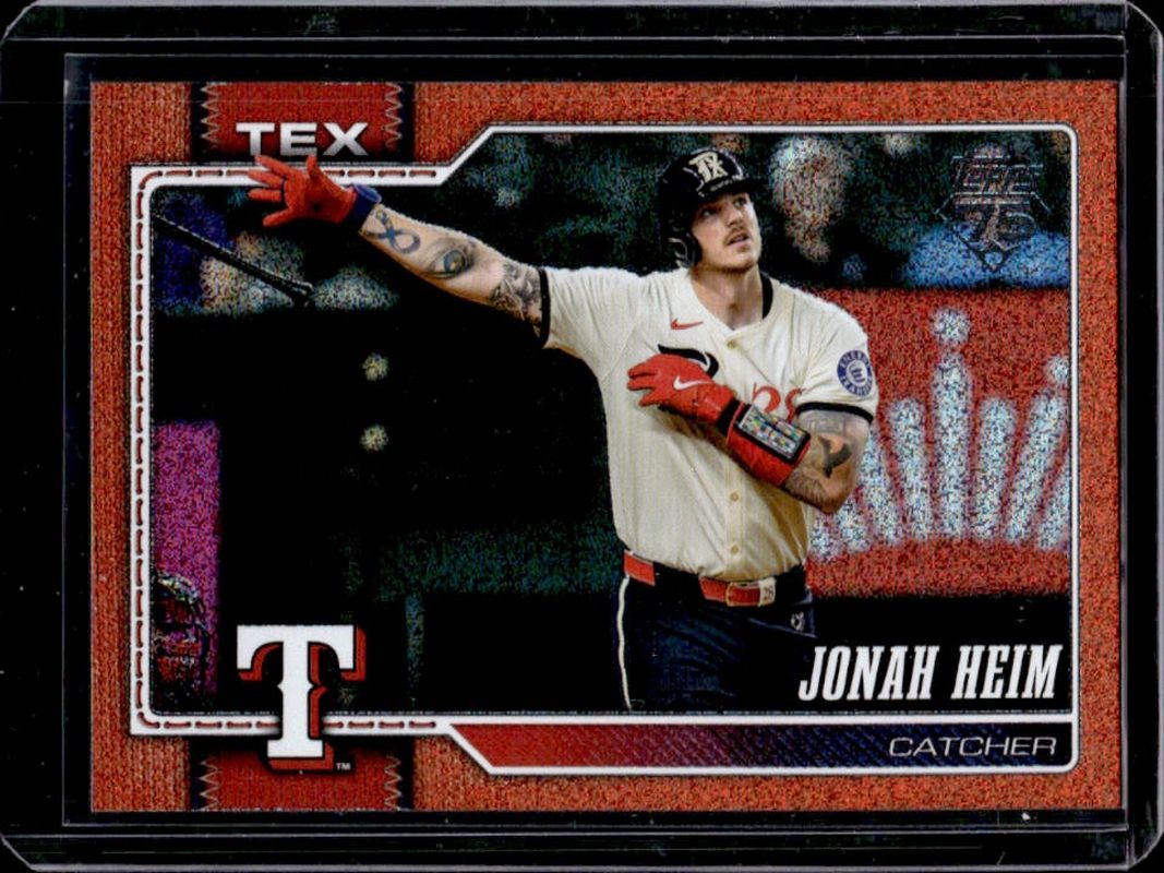 The Jonah Heim 2026 Topps #78 Orange Sandglitter /25 card is 1 of 57 Jonah Heim's card variations in the 2026 Topps set being tracked by Sports Card Investor, including Base, Aqua Holo Foil, Aqua Rainbow Foil, Diamante Foil, and Holo Foil.