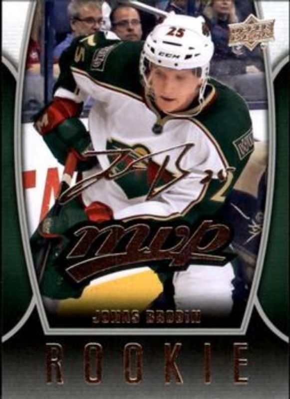 The Jonas Brodin 2013 Upper Deck #61 2013 Upper Deck MVP Rookie card is 1 of 13 Jonas Brodin's card variations in the 2013 Upper Deck set being tracked by Sports Card Investor, including Young Guns Base, Young Guns Canvas, Young Guns - Acetate, Young Guns - Jumbo, and Young Guns - UD Exclusives /100.