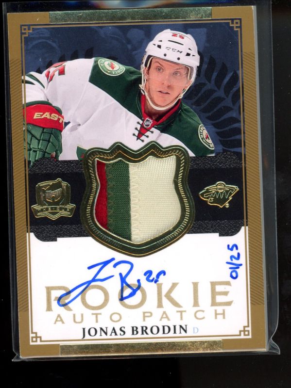 The Jonas Brodin 2013 Upper Deck The Cup #115 Gold Rainbow /25 Rookie card is 1 of 63 Jonas Brodin's card variations in the 2013 Upper Deck The Cup set being tracked by Sports Card Investor, including Base /249, Gold Rookie Autographed Patch /58, Gold /14, Black Laundry Tags /3, and Black Rookie Auto Tag /3.