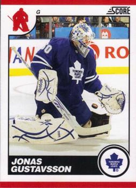 The Jonas Gustavsson 2010 Score #454 Base card is 1 of 7 Jonas Gustavsson's card variations in the 2010 Score set being tracked by Sports Card Investor, including 20th Anniversary, French Back, Glossy, Franchise, and Net Cam.