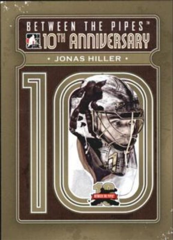 The Jonas Hiller 2011 In The Game Between the Pipes #BTPA-01 10th Anniversary card is 1 of 20 Jonas Hiller's card variations in the 2011 In The Game Between the Pipes set being tracked by Sports Card Investor, including Base, Anniversary Jumbo Glove, Anniversary Jumbo Jersey, Authentic Goaliegraph, and Countrymen Gold.