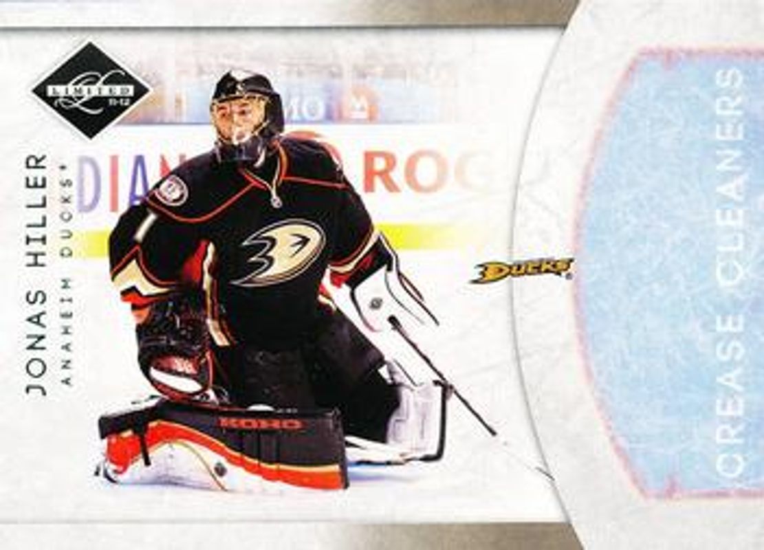 The Jonas Hiller 2011 Limited #10 Crease Cleaners /199 card is 1 of 16 Jonas Hiller's card variations in the 2011 Limited set being tracked by Sports Card Investor, including Base /299, Ruby Spotlight /49, Materials Prime /25, Monikers Gold /25, and Gold Spotlight /10.