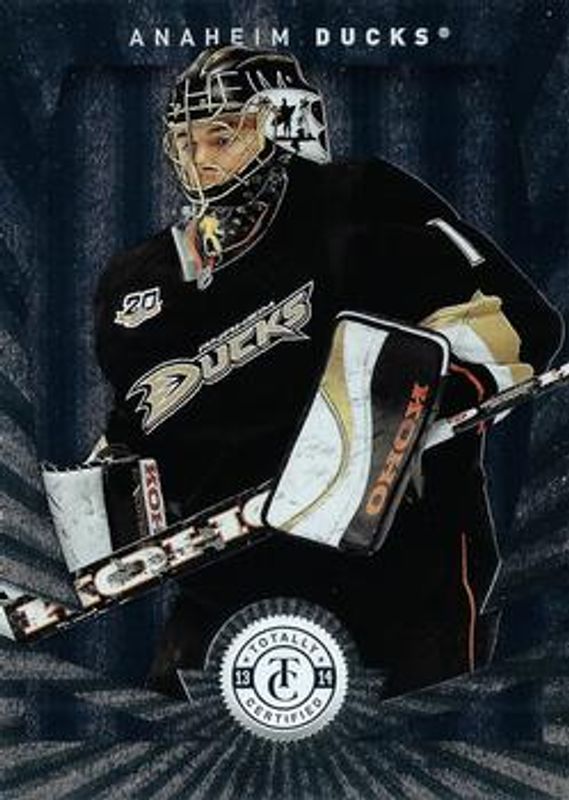 The Jonas Hiller 2013 Totally Certified #129 Base card is 1 of 18 Jonas Hiller's card variations in the 2013 Totally Certified set being tracked by Sports Card Investor, including Platinum Red /100, Platinum Blue /50, Mirror Platinum Purple /35, Mirror Platinum Red /25, and Platinum Gold /25.
