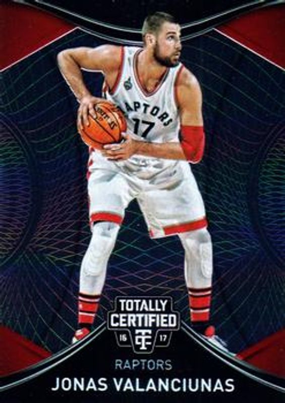 The Jonas Valanciunas 2016 Totally Certified #91 Base card is 1 of 18 Jonas Valanciunas' card variations in the 2016 Totally Certified set being tracked by Sports Card Investor, including Red /199, Blue /99, Orange /60, Camo /25, and Gold /10.