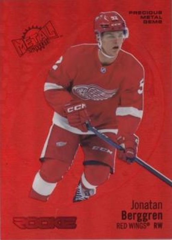 The Jonatan Berggren 2022 Metal Universe #189 Precious Metal Gems Red /100 Rookie card is 1 of 26 Jonatan Berggren's card variations in the 2022 Metal Universe set being tracked by Sports Card Investor, including Base, Spectrum FX Blue, Auto Silver FX /349, Spectrum FX Purple /199, and Precious Metal Gems Green /100.