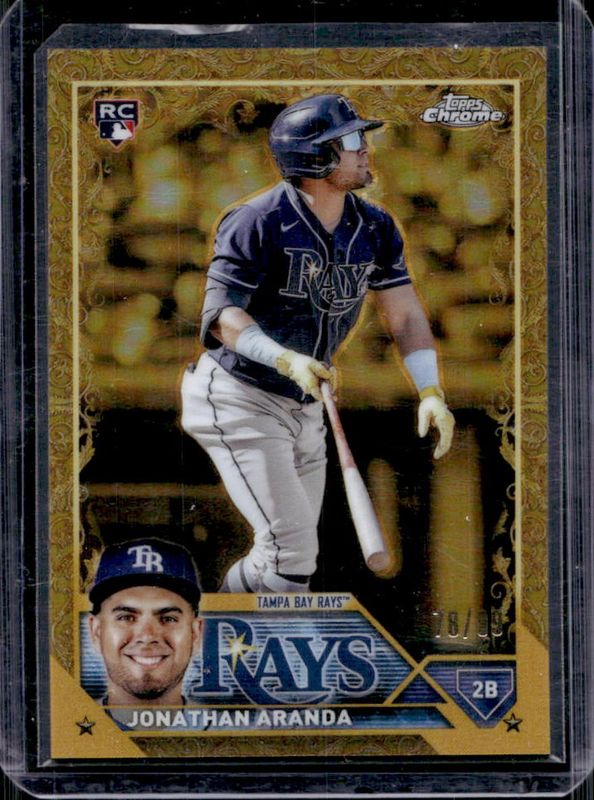 The Jonathan Aranda 2023 Topps Gilded Collection #52 Base /99 Rookie card is 1 of 6 Jonathan Aranda's card variations in the 2023 Topps Gilded Collection set being tracked by Sports Card Investor, including Wave Gold Etch Refractor /75, Mini-Diamond Gold Etch Refractor /50, RayWave Gold Etch Refractor /25, Lava Gold Etch Refractor /10, and Superfractor /1.