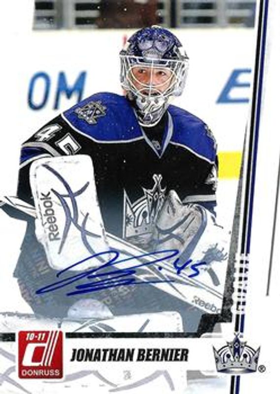 The Jonathan Bernier 2010 Donruss #163 die-cut Gems Autographs /25 card is 1 of 4 Jonathan Bernier's card variations in the 2010 Donruss set being tracked by Sports Card Investor, including Base, Press Proofs /100, and die-cut Gems /30.