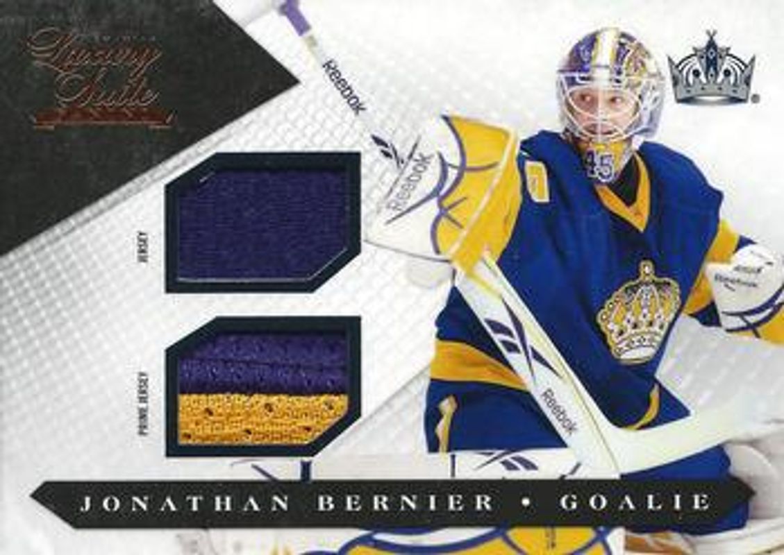 The Jonathan Bernier 2010 Panini Luxury Suite #33 Jerseys Prime /150 card is 1 of 19 Jonathan Bernier's card variations in the 2010 Panini Luxury Suite set being tracked by Sports Card Investor, including Base /899, Gold /10, Black /1, Printing Plate Black /1, and Printing Plate Cyan /1.