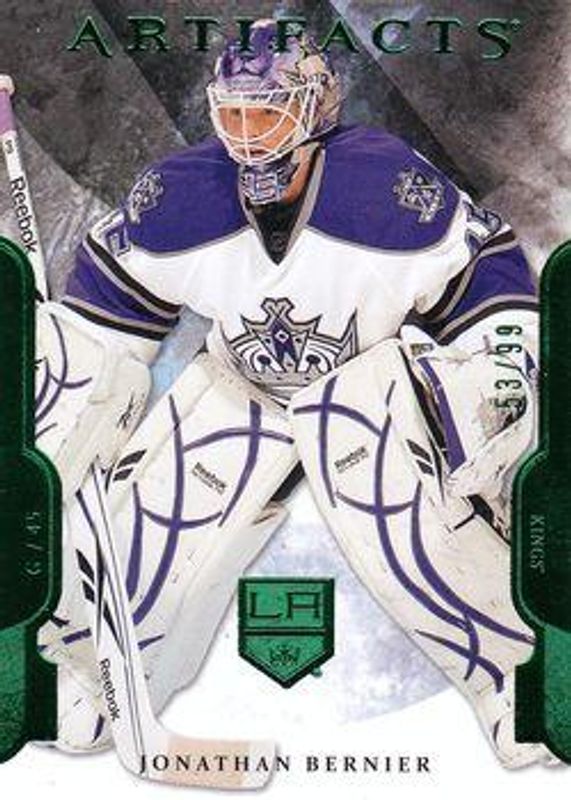 The Jonathan Bernier 2011 Upper Deck Artifacts #45 Emerald /99 card is 1 of 16 Jonathan Bernier's card variations in the 2011 Upper Deck Artifacts set being tracked by Sports Card Investor, including Base /699, Spectrum /25, Black /5, Jerseys /125, and Jerseys Patch - Emerald /65.