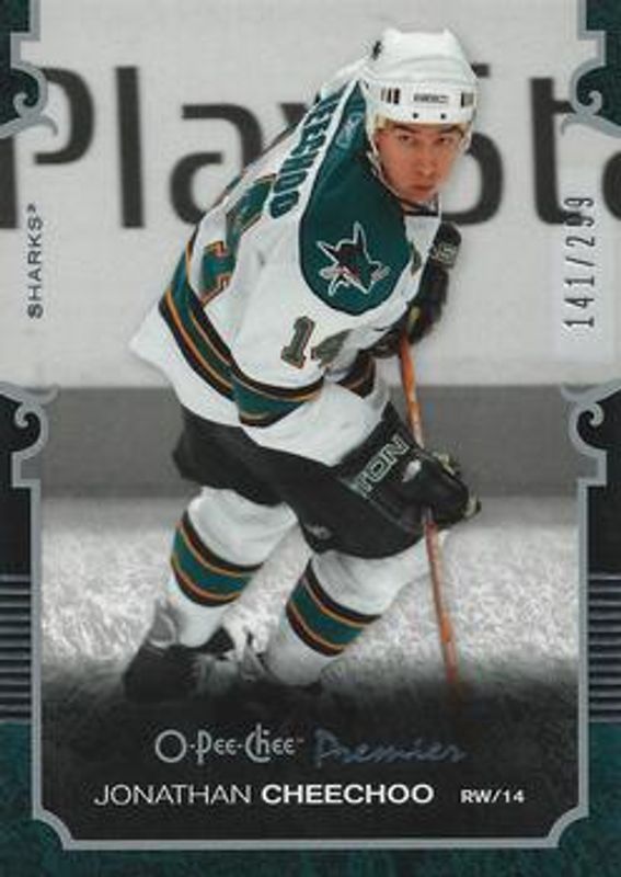 The Jonathan Cheechoo 2007 O-Pee-Chee Premier #94 Base /299 card is 1 of 12 Jonathan Cheechoo's card variations in the 2007 O-Pee-Chee Premier set being tracked by Sports Card Investor, including Gold /50, Silver Spectrum /35, Gold Spectrum /15, Black /1, and Remnants Triples /100.