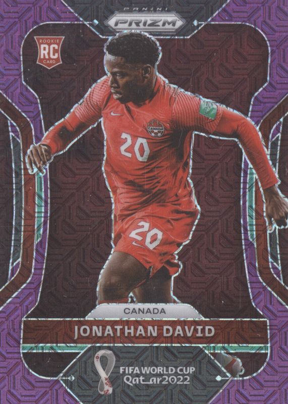 2022 Panini Prizm World Cup Qatar Jonathan David Canada Purple Mojo /49 RC card