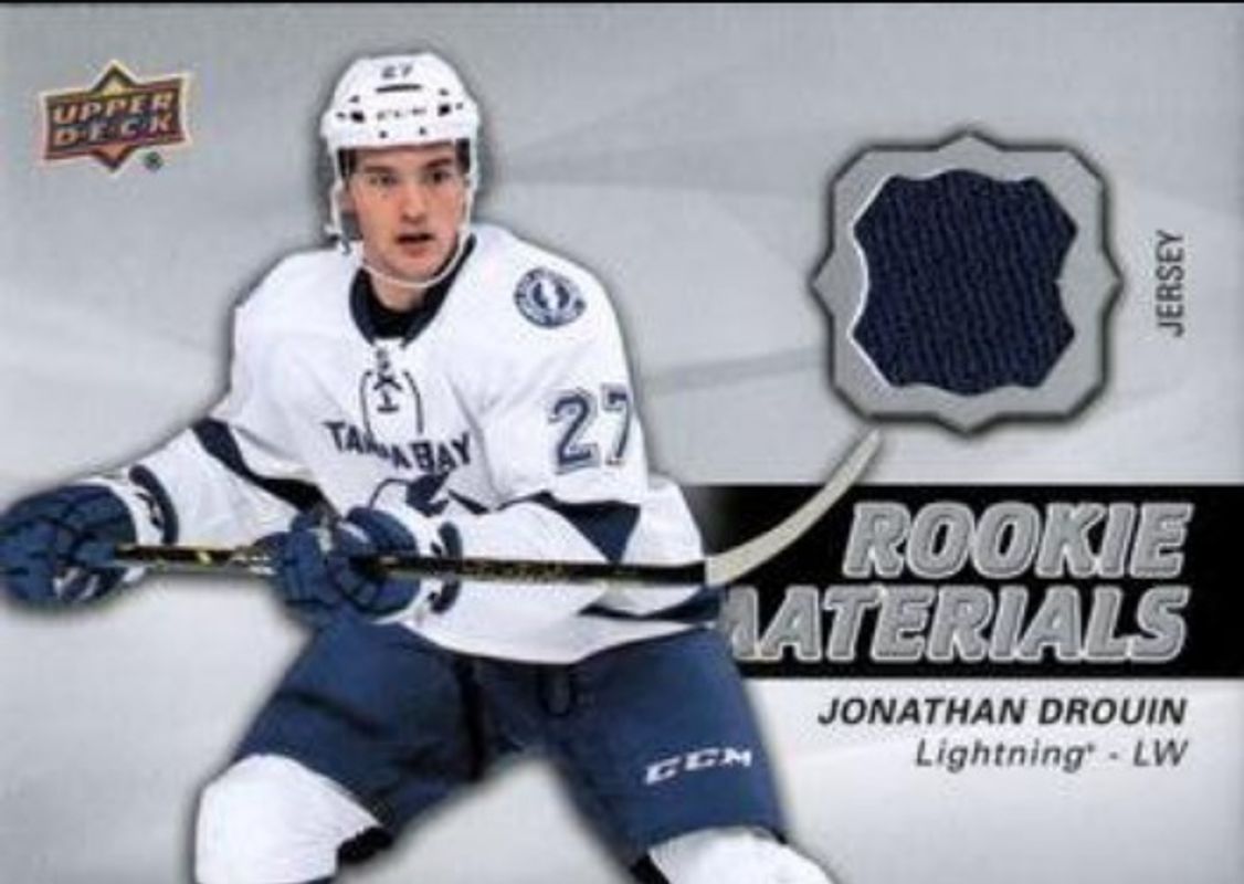 The Jonathan Drouin 2014 Upper Deck #RM2 Rookie Materials card is 1 of 21 Jonathan Drouin's card variations in the 2014 Upper Deck set being tracked by Sports Card Investor, including Young Guns Base, Young Guns Canvas, Young Guns - Acetate, Young Guns - UD Exclusives /100, and Young Guns - UD High Gloss /10.
