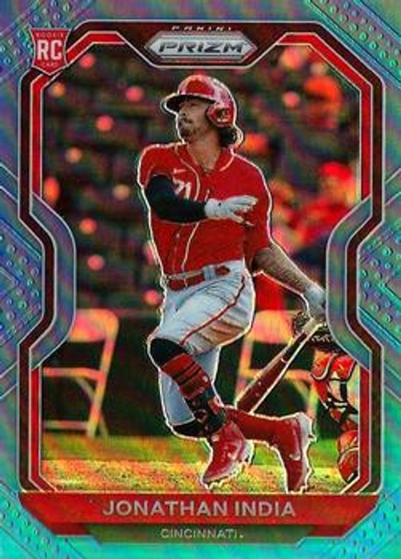 The Jonathan India 2021 Prizm #26 Carolina Blue Rookie card is 1 of 43 Jonathan India's card variations in the 2021 Prizm set being tracked by Sports Card Investor, including Base, Blue, Blue Velocity, Cosmic Haze, and Giraffe.