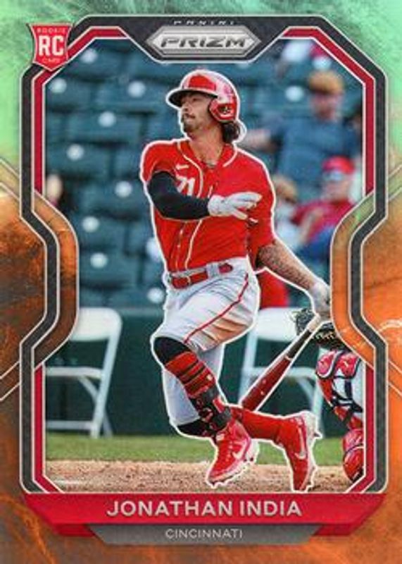 The Jonathan India 2021 Prizm #26 Cosmic Haze Rookie card is 1 of 43 Jonathan India's card variations in the 2021 Prizm set being tracked by Sports Card Investor, including Base, Blue, Blue Velocity, Carolina Blue, and Giraffe.