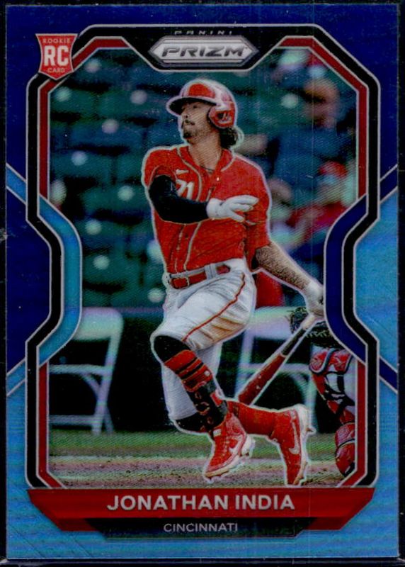The Jonathan India 2021 Prizm #26 Navy Blue-Carolina Blue Rookie card is 1 of 43 Jonathan India's card variations in the 2021 Prizm set being tracked by Sports Card Investor, including Base, Blue, Blue Velocity, Carolina Blue, and Cosmic Haze.