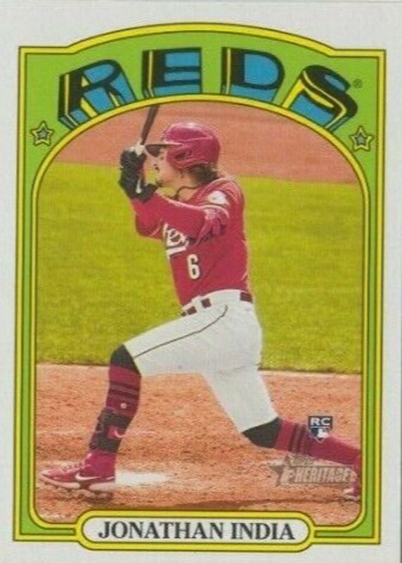 This card is 1 of 6 Jonathan India's card variations in the 2021 Topps Heritage High Number set being tracked by Sports Card Investor, including Purple Hot Box Refractor, Chrome /999, Chrome Refractor /572, Real One Autographs, and Real One Autographs - Red Ink /72.