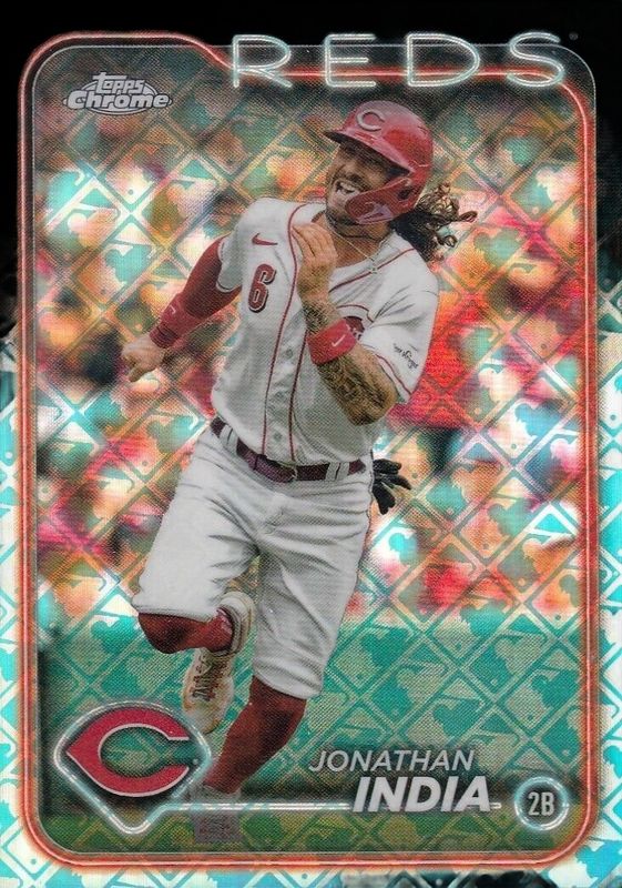 The Jonathan India 2024 Topps Chrome Logofractor Edition #185 Base card is 1 of 10 Jonathan India's card variations in the 2024 Topps Chrome Logofractor Edition set being tracked by Sports Card Investor, including Purple /250, Aqua /199, Blue /150, Green /99, and Gold /50.