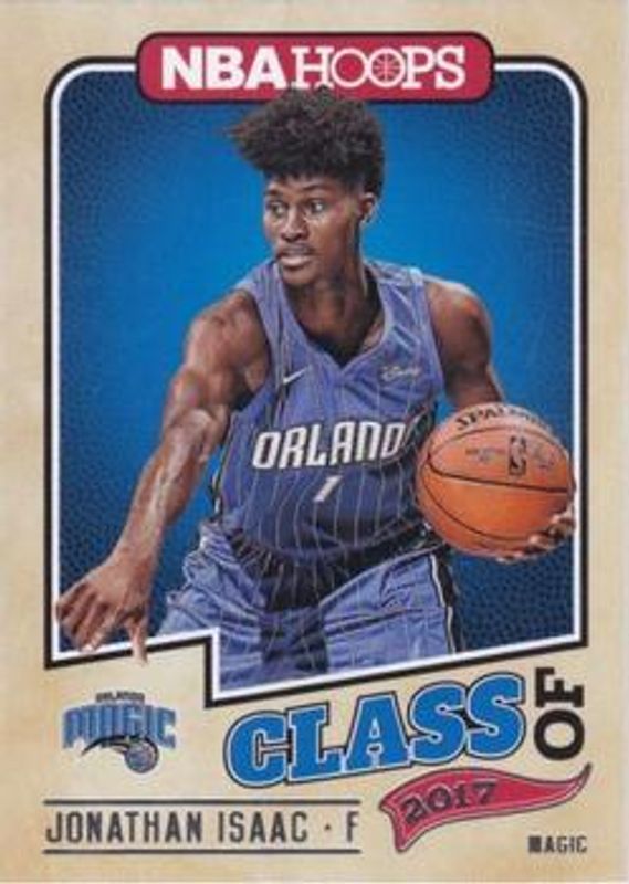 The Jonathan Isaac 2017 Hoops #6 Class of 2017 Rookie card is 1 of 31 Jonathan Isaac's card variations in the 2017 Hoops set being tracked by Sports Card Investor, including Base, Premium Factory Set /199, Blue, Faces of the Future, and Great SIGnificance.