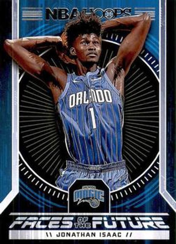 The Jonathan Isaac 2017 Hoops #6 Faces of the Future Rookie card is 1 of 31 Jonathan Isaac's card variations in the 2017 Hoops set being tracked by Sports Card Investor, including Base, Premium Factory Set /199, Blue, Class of 2017, and Great SIGnificance.