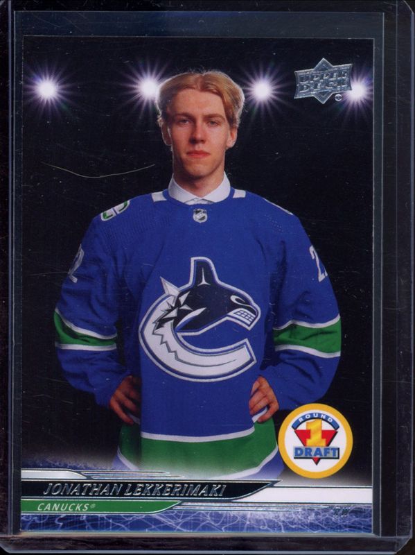 The Jonathan Lekkerimaki 2024 Upper Deck Extended Series #745 Base Rookie card is 1 of 69 Jonathan Lekkerimaki's card variations in the 2024 Upper Deck Extended Series set being tracked by Sports Card Investor, including #706 Base, #706 Young Guns Base, #745 Clear Cut, #706 Clear Cut, and #745 Outburst.