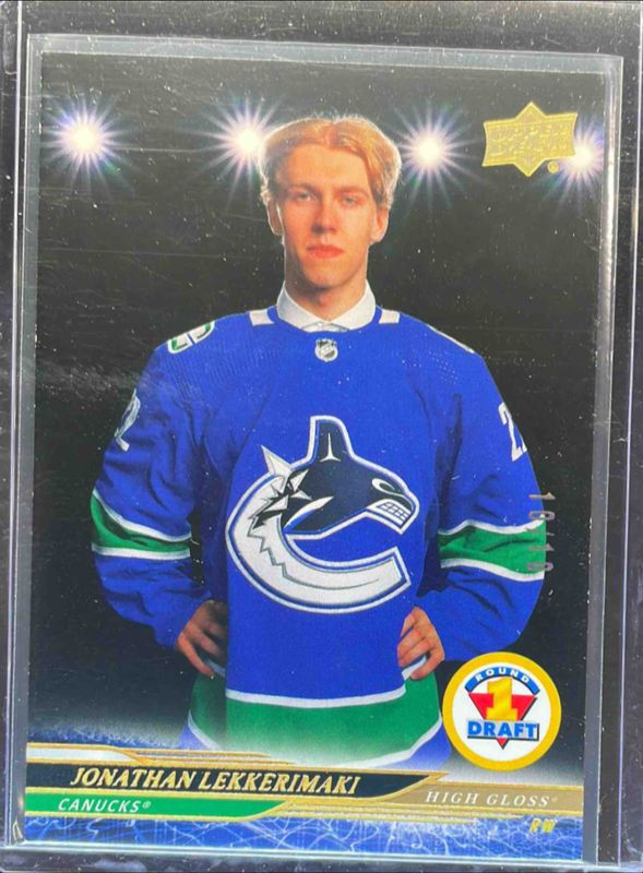 The Jonathan Lekkerimaki 2024 Upper Deck Extended Series #745 High Gloss /10 Rookie card is 1 of 69 Jonathan Lekkerimaki's card variations in the 2024 Upper Deck Extended Series set being tracked by Sports Card Investor, including #745 Base, #706 Base, #706 Young Guns Base, #745 Clear Cut, and #706 Clear Cut.