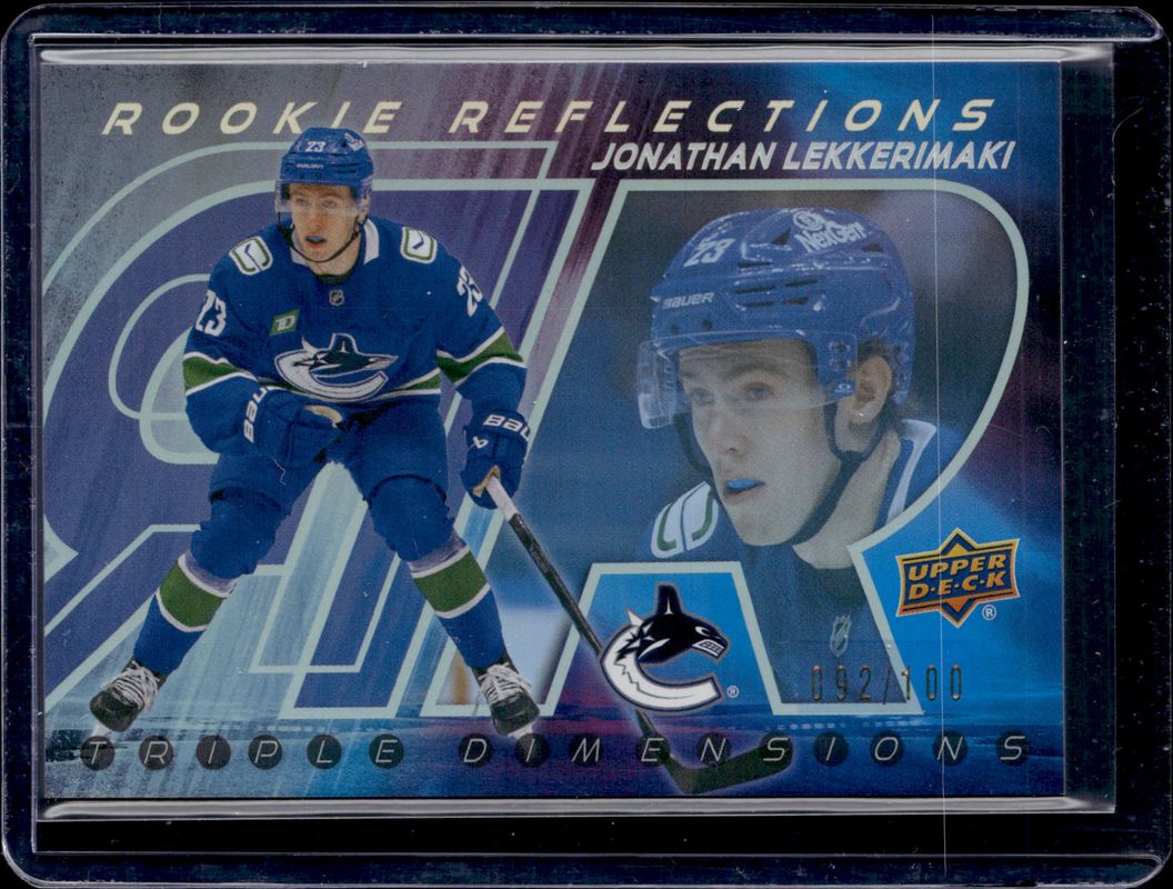The Jonathan Lekkerimaki 2024 Upper Deck Extended Series #RR-18 Rookie Reflections - Gold /100 card is 1 of 69 Jonathan Lekkerimaki's card variations in the 2024 Upper Deck Extended Series set being tracked by Sports Card Investor, including #745 Base, #706 Base, #706 Young Guns Base, #745 Clear Cut, and #706 Clear Cut.